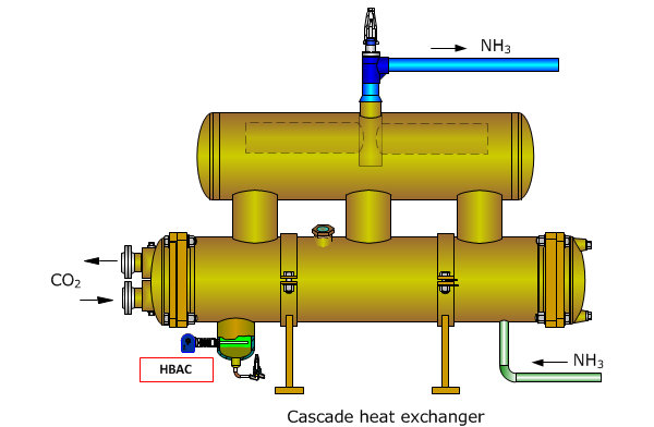 HBAC is used for detecting leakage in cascade systems. The sensor triggers an alarm if there is an CO2 leak in the NH3 part. A leak results in several hours of cleaning the pipes and heat exchanger. If a CO2 leak occurs in the NH3 part, salt crystals are formed. These salt crystals are very corrosive and lead to clogging of the parts. If the leak is not stopped in time, it can lead to extensive damage to